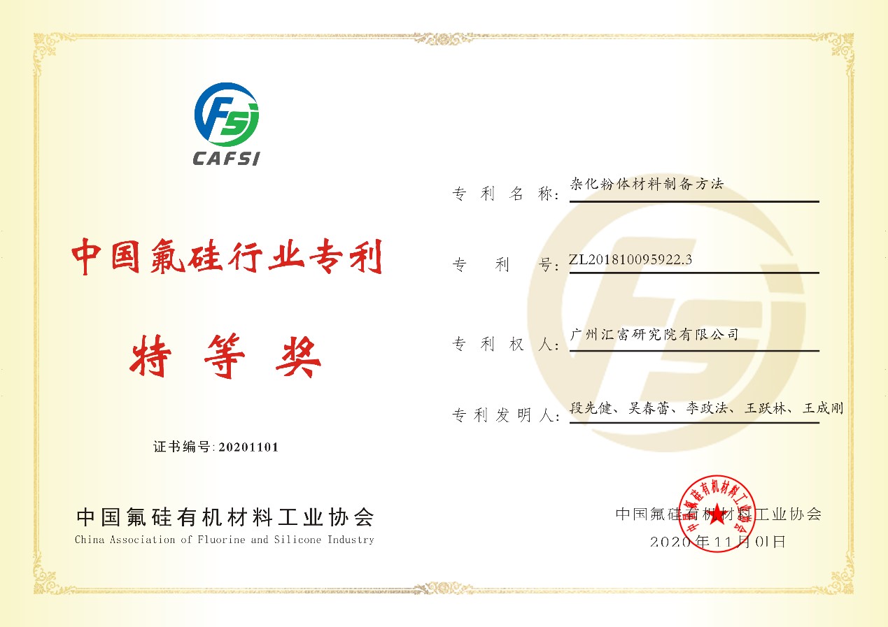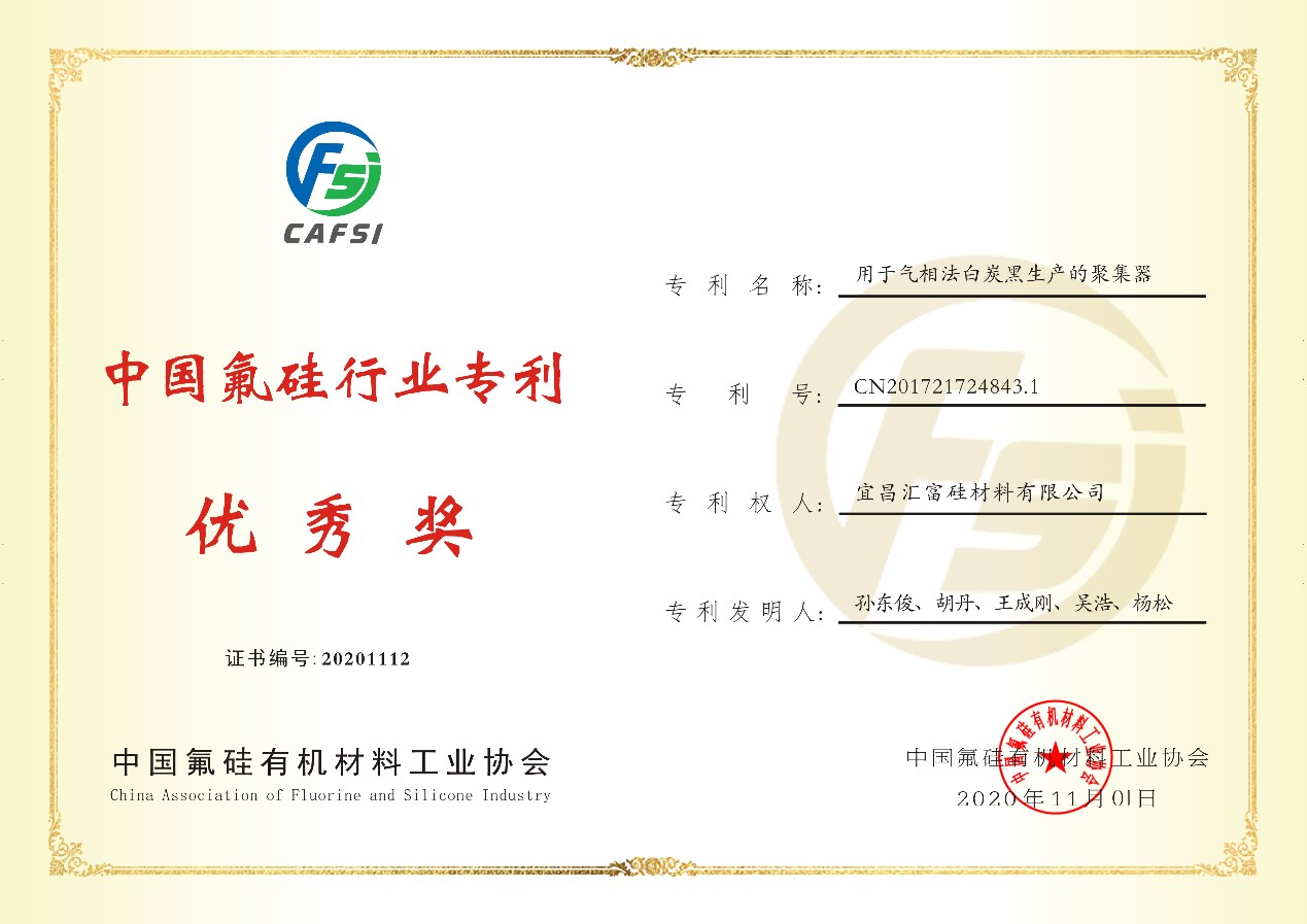 會議期間頒發(fā)了2020年中國氟硅行業(yè)專利獎,湖北匯富納米材料股份有限公司(原名宜昌匯富硅材料有限公司)及其全資子公司廣州匯富研究院有限公司參評兩項專利獲獎。其中《雜化粉體材料制備方法》榮獲特等獎,《用于氣相法白炭黑生產(chǎn)的聚集器》榮獲優(yōu)秀獎。